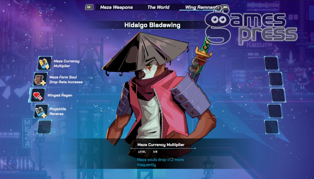 Das Spiel bietet acht fordernde Roguelite-Zonen voller Gegner, Power-ups und Upgrades. Die Mezameta-Klinge lässt sich im Gefecht flexibel in eine Peitsche, ein Großschwert oder einen Hammer verwandeln. Mit Spezialfähigkeiten wie „Void Crow“ oder „Spark Falcon“ säuberst du das Schlachtfeld von feindlichen Tengu. Gekämpft wird im Takt eines Synthwave-Soundtracks, der die neonfarbenen Levels in stimmungsvollem 90er-Flair begleitet.