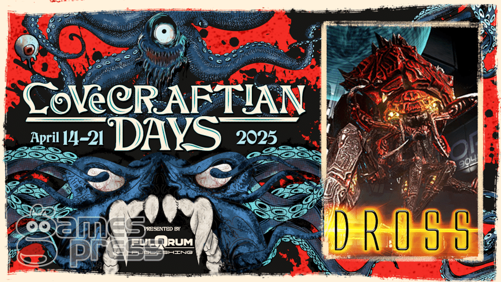 Team Derelict freut sich, bekannt zu geben, dass DROSS Teil der Lovecraftian Days 2025 auf Steam ist, die von Fulqrum Publishing organisiert werden. Entdecke alle gruseligen und faszinierenden, von Lovecraft inspirierten Spiele während dieser Woche bis zum 21. April 2025 auf Steam.